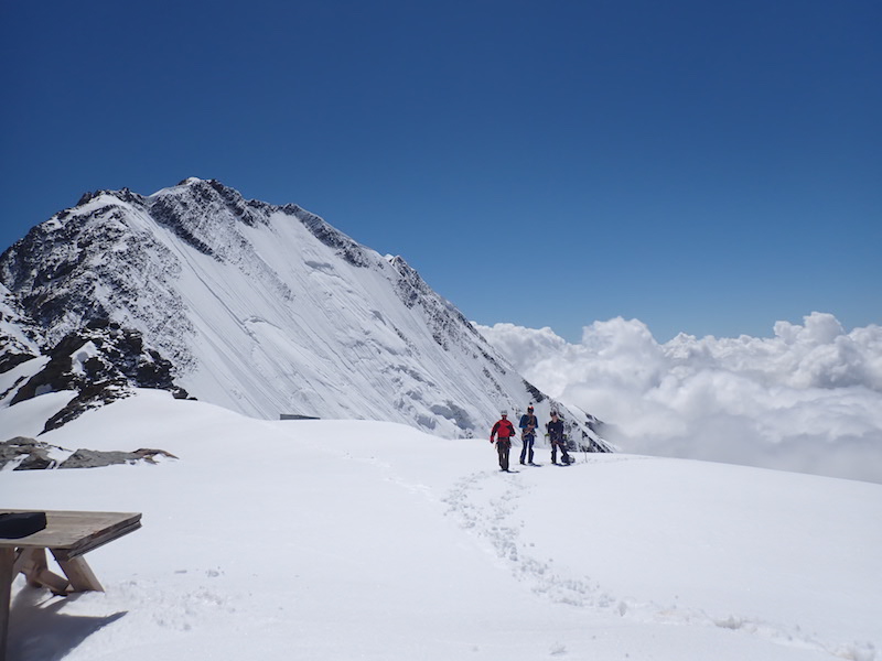 Jour 3: Bionnassay Mont Blanc et nuit au refuge du Gouter. Départ matinal pour escalader l'Aiguille de Bionnassay à 4052m. La pente en neige se redresse progressivement jusqu’à buter sur le bastion rocheux. Quelques longueurs d'escalade pas trop difficile nous amènes au pied de la raide pente sommitale. du sommet de l'Aiguille, nous verrons très bien la suite de l'itinéraire qui suit l’impressionnante arête neigeuse en direction du Mont Blanc. Selon les conditions, de neige et/ou de glace, la progression sera plus ou moins rapide. L'objectif du sommet du Mont Blanc est à portée de main mais si loin à la fois. La descente se fera soit en dormant au refuge du gouter soit par les trois Mont et en dormant au refuge des Cosmiques.